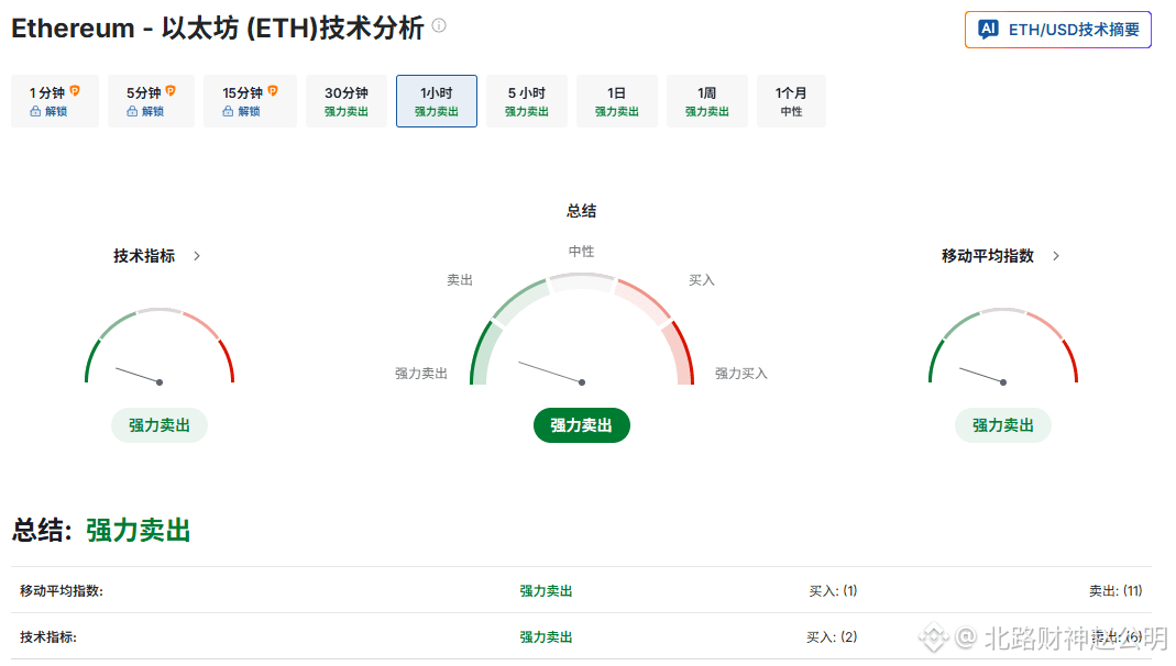 虽然图表显示金叉趋势,但白线位于0轴下方且能量严重萎缩,这分明是下跌中继的“死猫跳”。技术指标更是绝望:从30分钟到日线,清一色亮出 “强力卖出” 红灯,移动平均指数出现 11个卖出信号对1个买入 的极端看空局面。市场已进入技术性熊市。