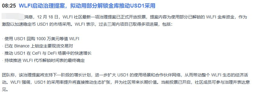 First, let's look at the news: community voting, using real funds from the treasury to promote USD1, and they have already repurchased 10 million dollars! This is definitely a solid positive signal, indicating that the project team is working hard and wants to expand the ecosystem.
