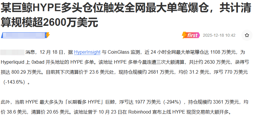 A 'giant whale' was continuously liquidated on Hyperliquid, with a single transaction exceeding 11 million, totaling over 26 million USD.