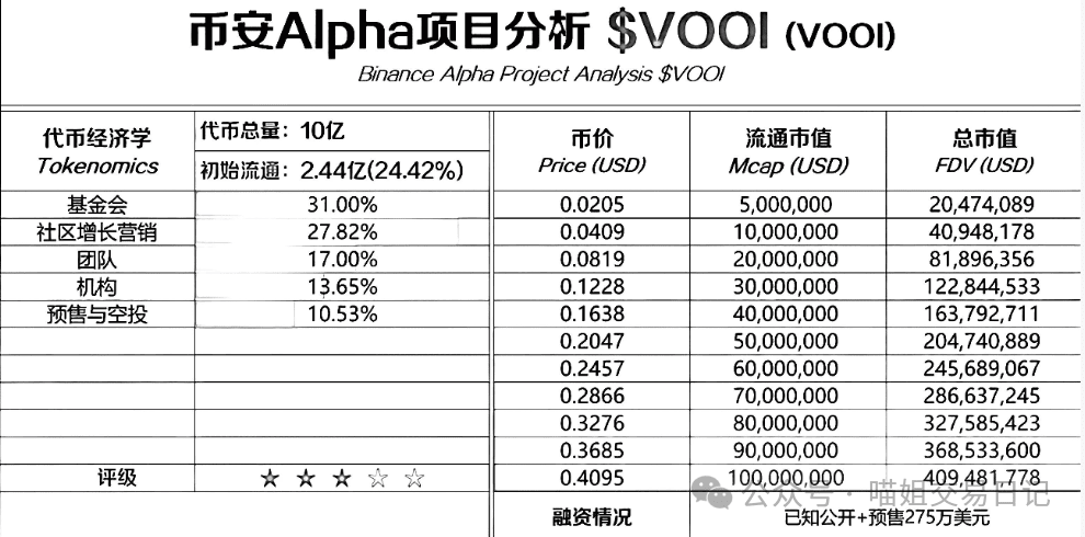 The total supply of tokens is 1 billion, with an initial circulation of 244 million (24.42%). The pre-market price is $0.11, and the pool price is $0.1, corresponding to a circulating market value of $24 million and an FDV of $100 million.