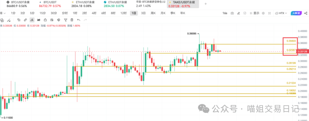 Currently, there are no signs of selling; accumulation continues, with no large outflows. I don't know how it will move next. The key positions for market makers are 0.35 and 0.325. Whether going long or short, use the key stop-loss levels of 0.35 and 0.325, and also consider the lower level of 0.281.