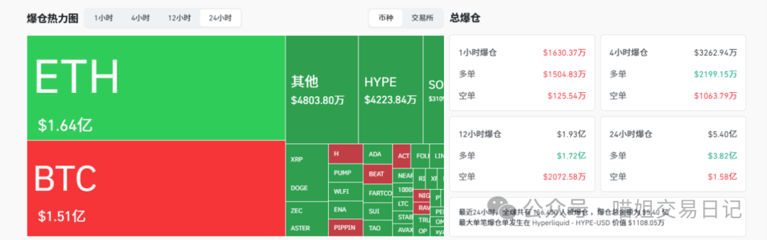 In the last 24 hours, a total of 156,558 people worldwide have been liquidated, with a total liquidation amount of $540 million! Bitcoin and Ethereum experienced a drastic market movement yesterday, as tomorrow is the 19th, when news about Japan's interest rate hike will be released. After the US stock market opens, it also plummeted significantly, indicating that funds are seeking safety.