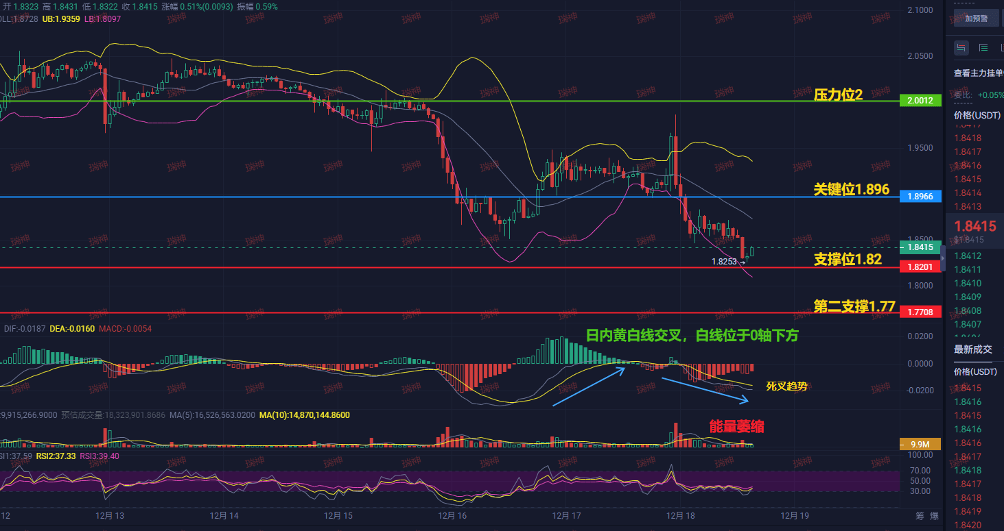 Rui God's judgment is straightforward: the downward trend of XRP is intact, before breaking and stabilizing at 1.89 with volume, all rises are regarded as 'technical rebounds' and 'trap for longs'. A more likely path is: briefly rising on ETF news, attracting follow-up orders, then encountering resistance below the key level of 1.89, turning down to test the support at 1.82 or even 1.77.