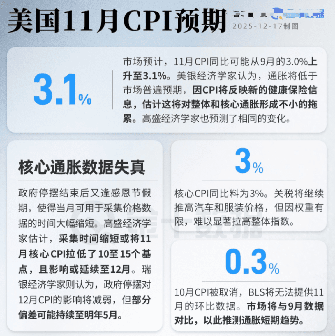 Tonight at 21:30, the US November CPI data will be released! It was originally scheduled for December 10, but was postponed due to the government shutdown, making the change feel quite nerve-wracking.