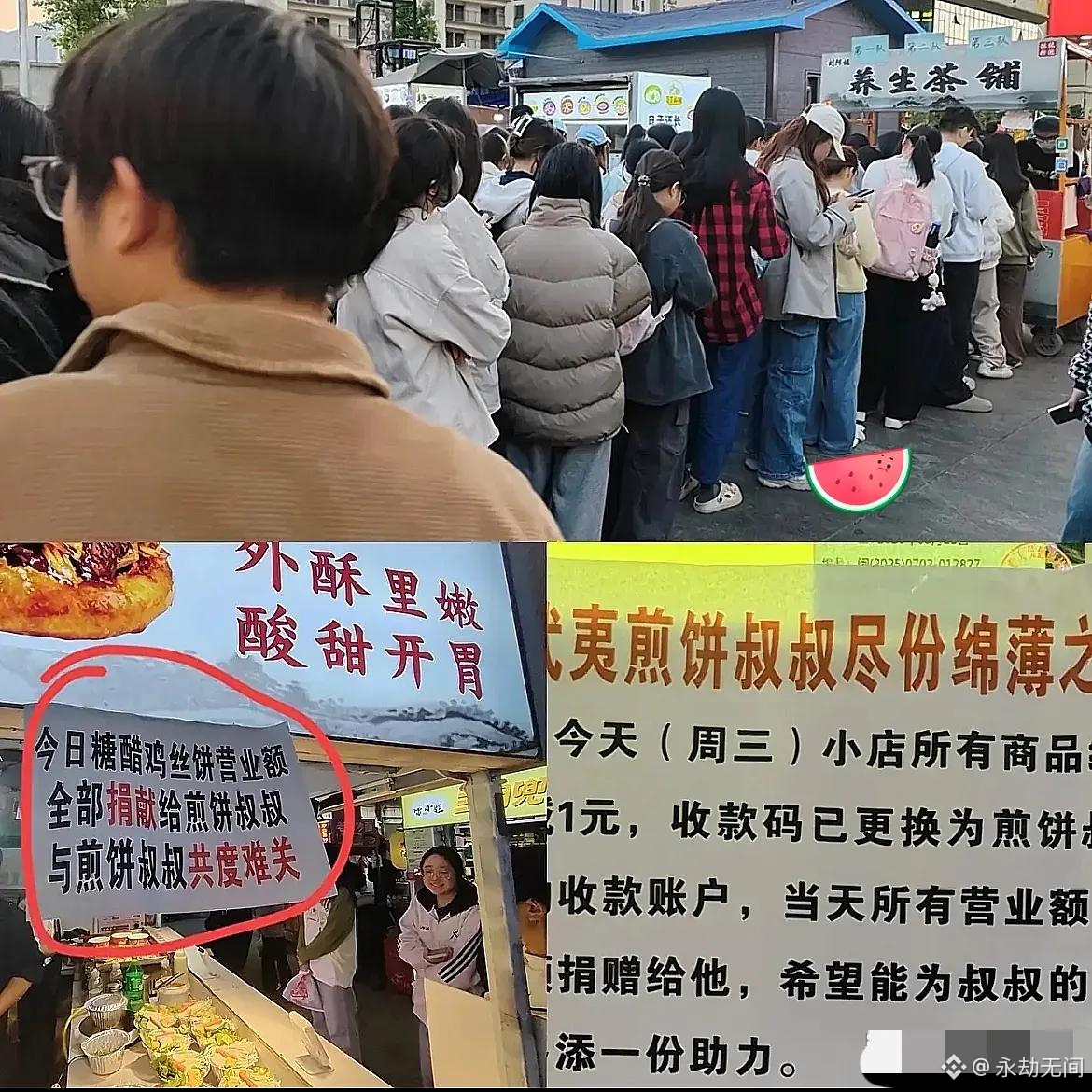 糖水铺老板把招牌改了,写着今日营业额全捐给煎饼叔叔,还把糖水打八折吸引顾客;卖糖醋鸡丝饼的摊主也立了块牌子,说当天赚的钱一分不留全给老张;还有养生茶铺、烤串店,一家挨着一家,把自己的收款码全换成了老张的。小吃街的顾客们也格外暖心,知道了这事,特意绕路来这条街消费,队伍排了老长,有人买杯糖水,有人要份煎饼,嘴上说着“帮衬下老张”,手里递钱的动作格外干脆。
