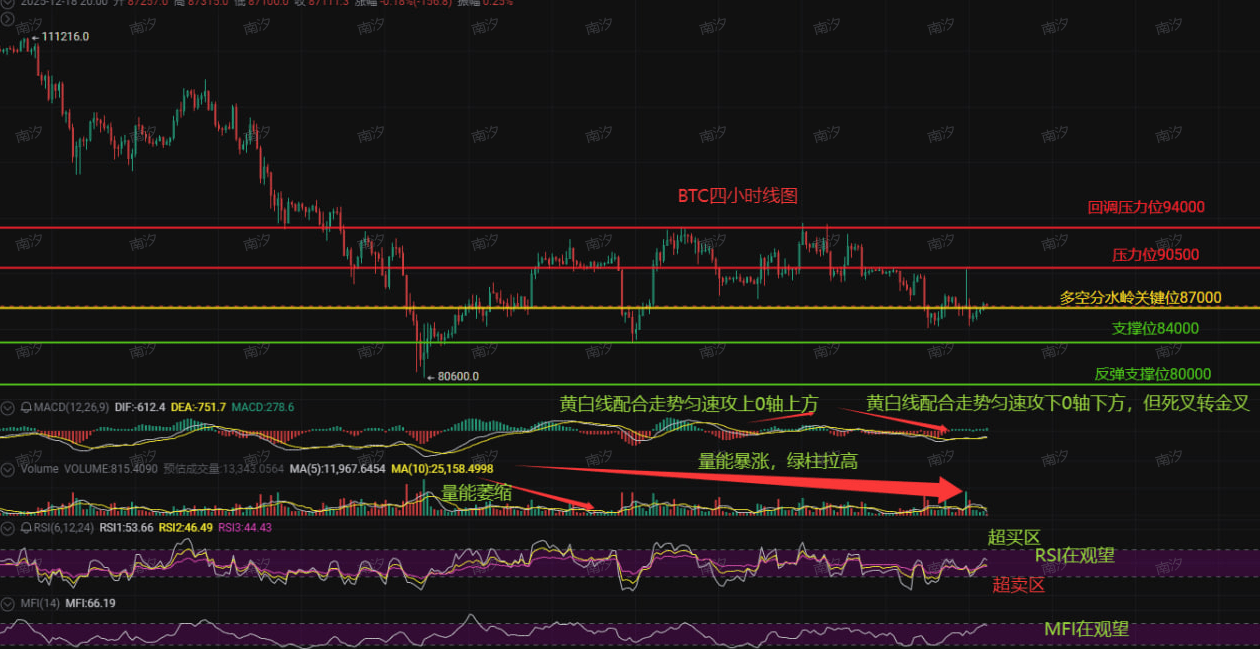 87000 is not only the dividing line of long and short positions on the four-hour chart but also a psychological barrier. If it breaks below here, the market may accelerate downwards to look for 84000 or even 80000. But if it can stabilize at 87000, short-term trading can 'take a bite of the rebound meat' between 87000-90500. Remember the mantra: if it doesn't go up, go short; if it breaks, wait; don’t be greedy on the rebound.