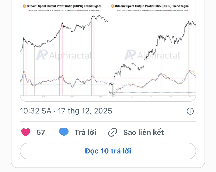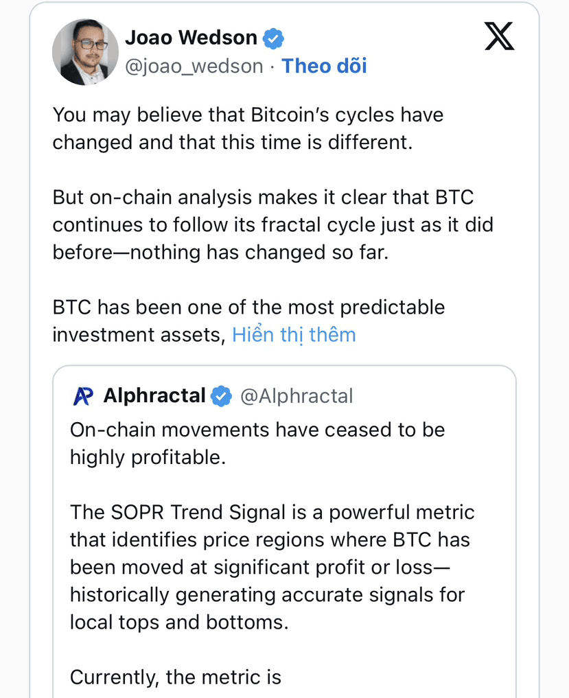 João Wedson, founder of the on-chain analysis company Alphractal, pointed out signals from the SOPR (Spent Output Profit Ratio) index, a tool that helps identify the end point of the Bitcoin bull market. According to historical data, SOPR often marks market turning points by tracking the shift between profit-taking and loss sales.