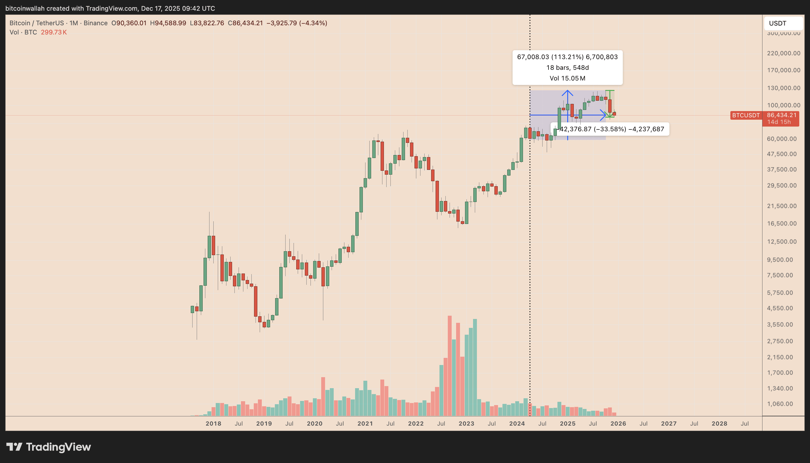 The current cycle is no exception. Bitcoin peaked at nearly 126,200 USD in October, exactly 18 months after the halving in April 2024, before falling more than 30%.