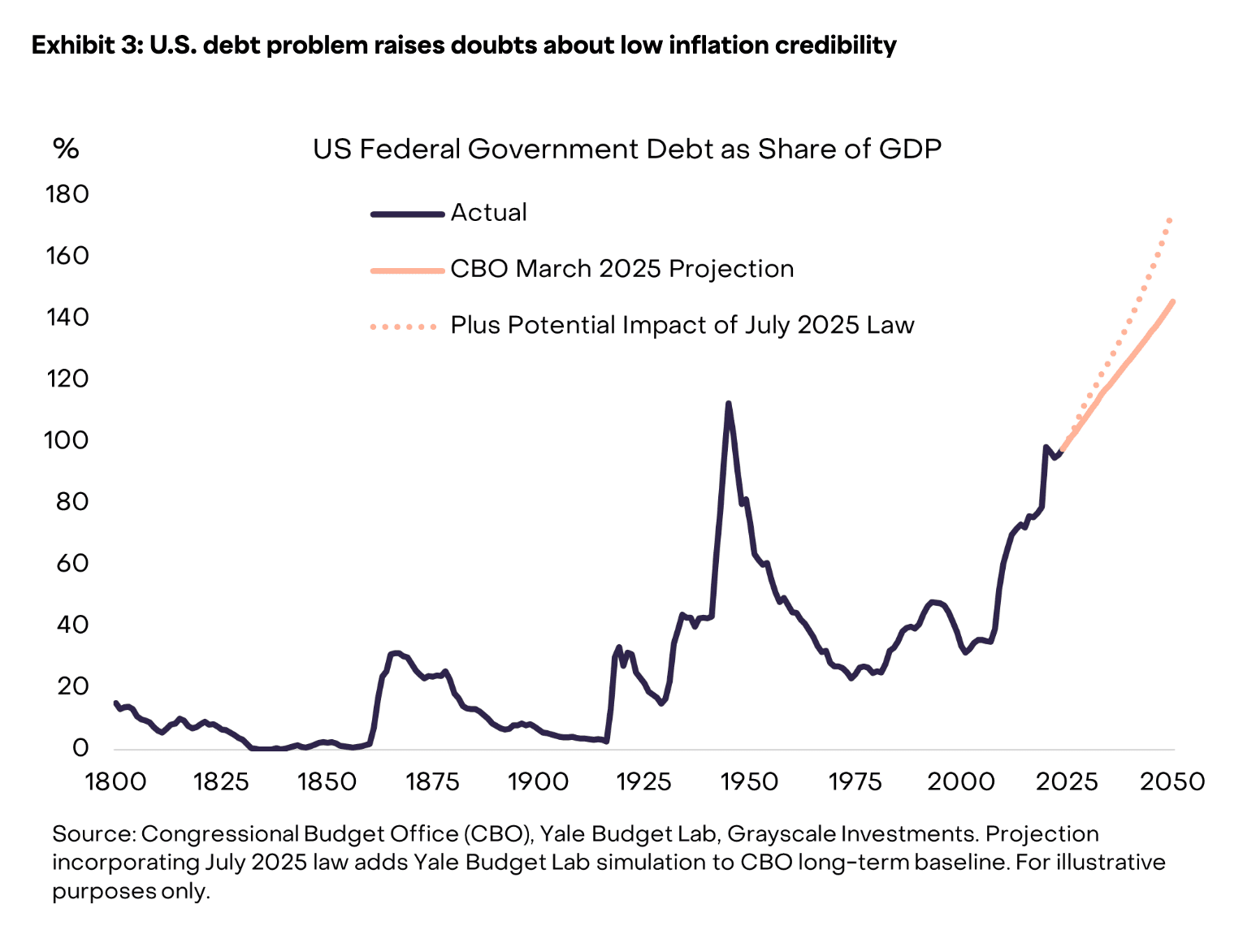 'Fiat currencies and assets priced in fiat currencies face significant risks due to rising public debt, leading to long-term inflation risks. Scarce assets like gold, physical silver, or digital Bitcoin and Ether could play a counterbalancing role in investment portfolios against fiat currency risks.'