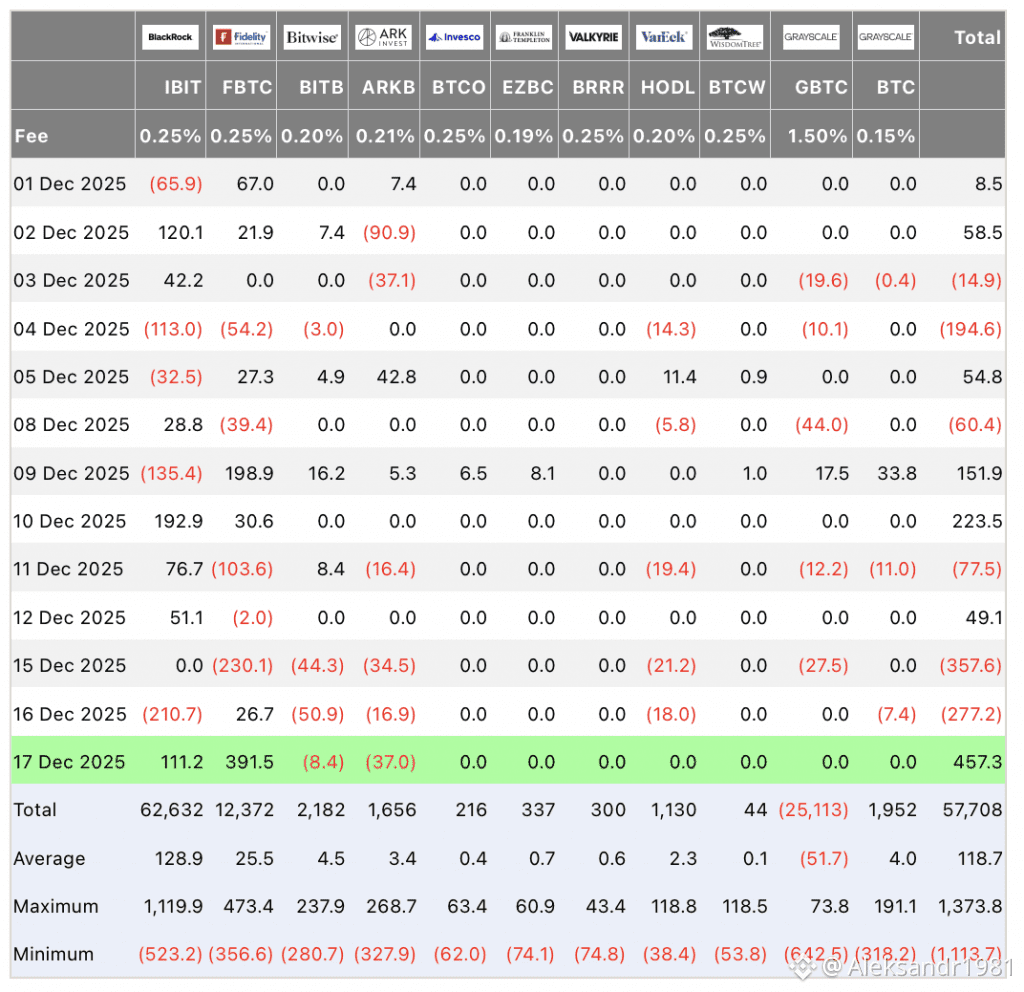 17 декабря спотовые биржевые фонды биткоина зарегистрировали чистый приток в размере $457 млн — это самый крупный однодневный показатель за последний месяц. Институциональный спрос показал признаки нового ускорения после периода неопределенности.