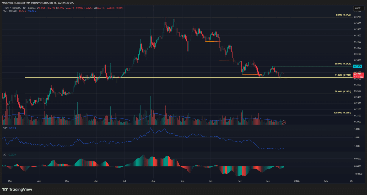 Despite the fact that the network is a machine of real utility, the price of TRX has been in a deep retracement since August. Technical analysis shows us that the token fell below its 365-day moving average (the 365DMA), which is like the long-term health line. It is also below the 50 and 100-day averages, which means that, for now, sellers have control of the wheel. 📉🚜
