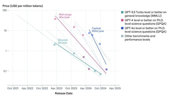 根据 SemiAnalysis 和 Epoch AI 的 2025 年第四季度追踪数据,单位 AI 推理(Inference)成本在过去一年内同比下降了 20–40%。