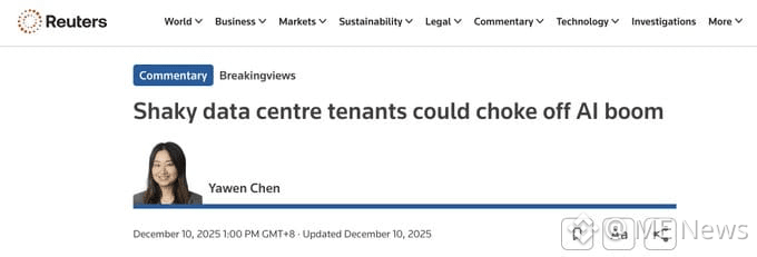 Reuters 和 Bloomberg 在 12 月的连续报道揭开了冰山一角:AI 基建正在快速变成一个“债务密集型行业”。但这只是表象,真正的危机在于深层的金融结构错配——当高折旧的算力资产、高波动的矿工抵押物,与刚性的基础设施债务被强行捆绑时,一条隐秘的违约传导链已经形成。