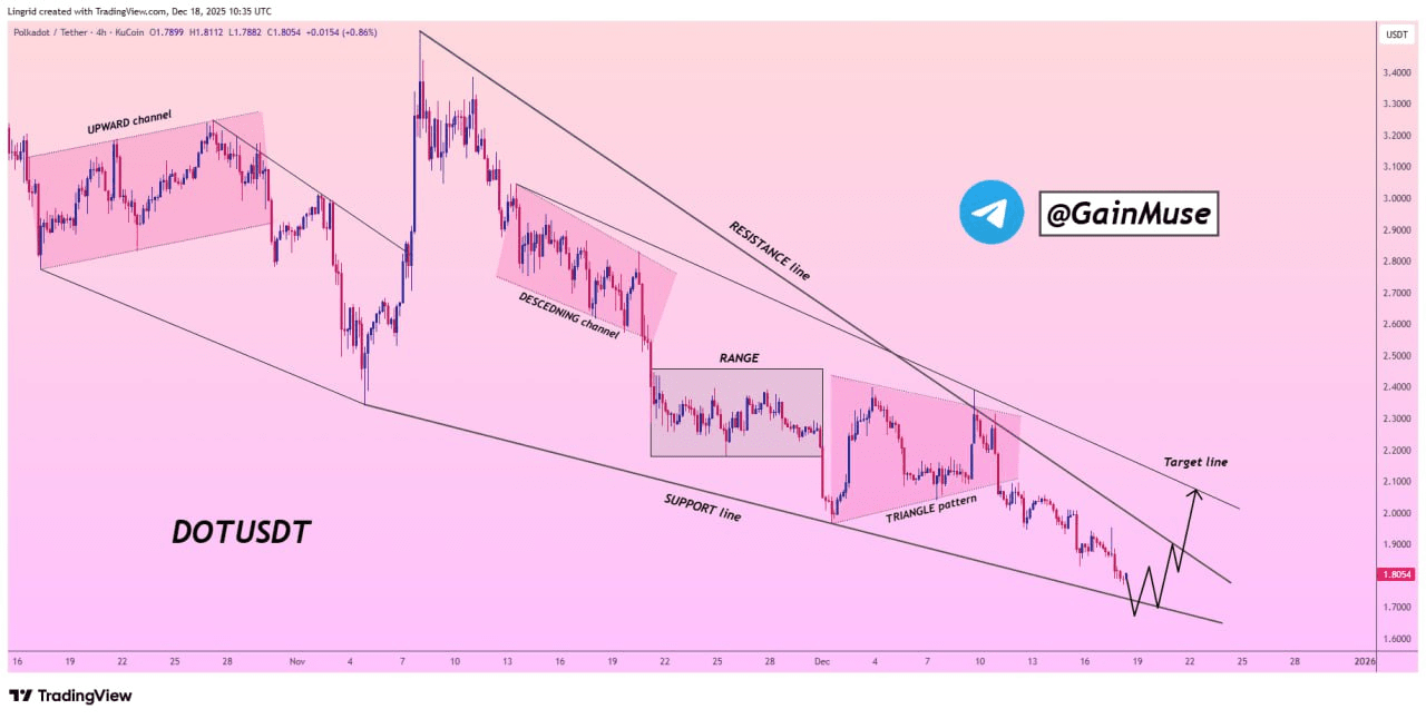 Analyses from GainMuse show that DOT is stabilizing near a long-term support area, with a clear slowdown in downward momentum as the price hovers near key technical levels.