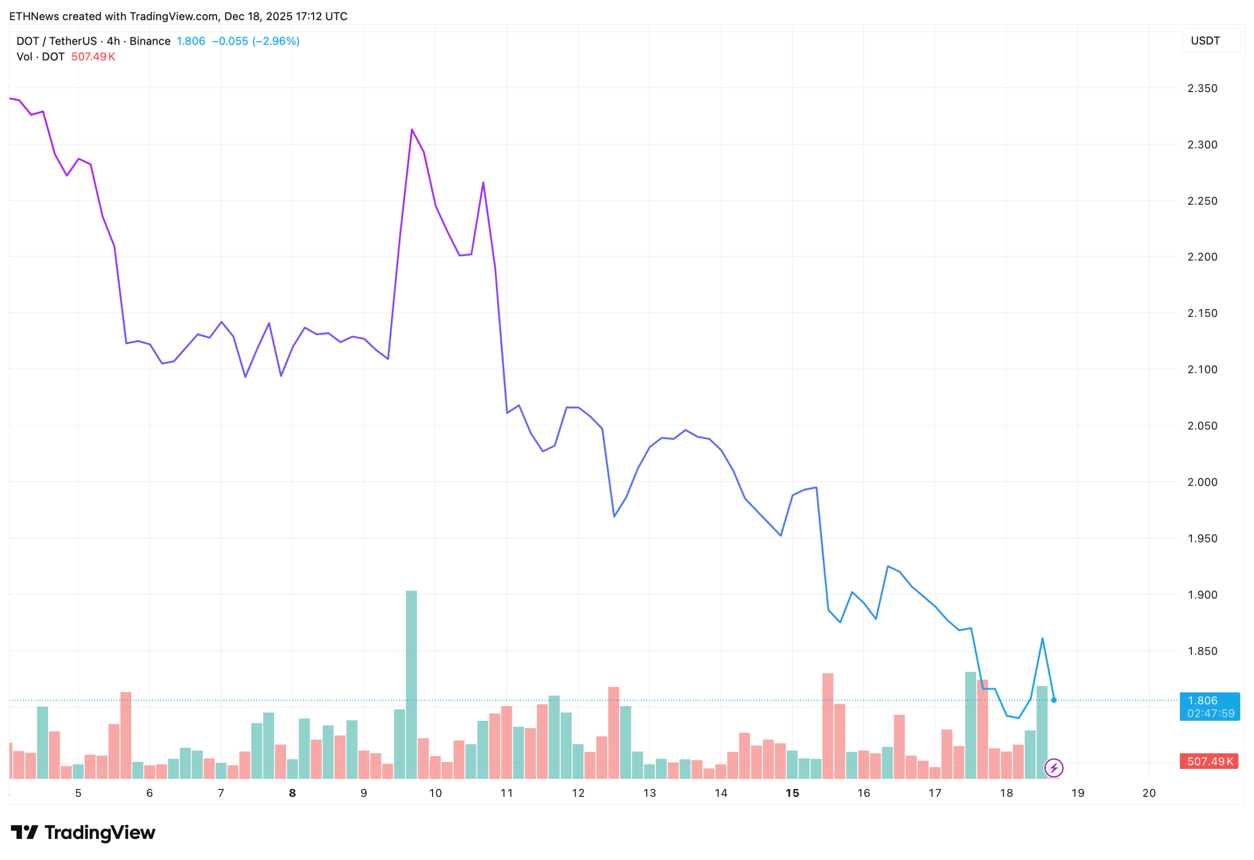 TradingView chart shows that DOT/USDT is trading around $1.80, after a steady decline from higher levels at the beginning of the month. Despite multiple attempts to push below, the price consistently reacts near the same horizontal support area, indicating that sellers are struggling to extend the move.
