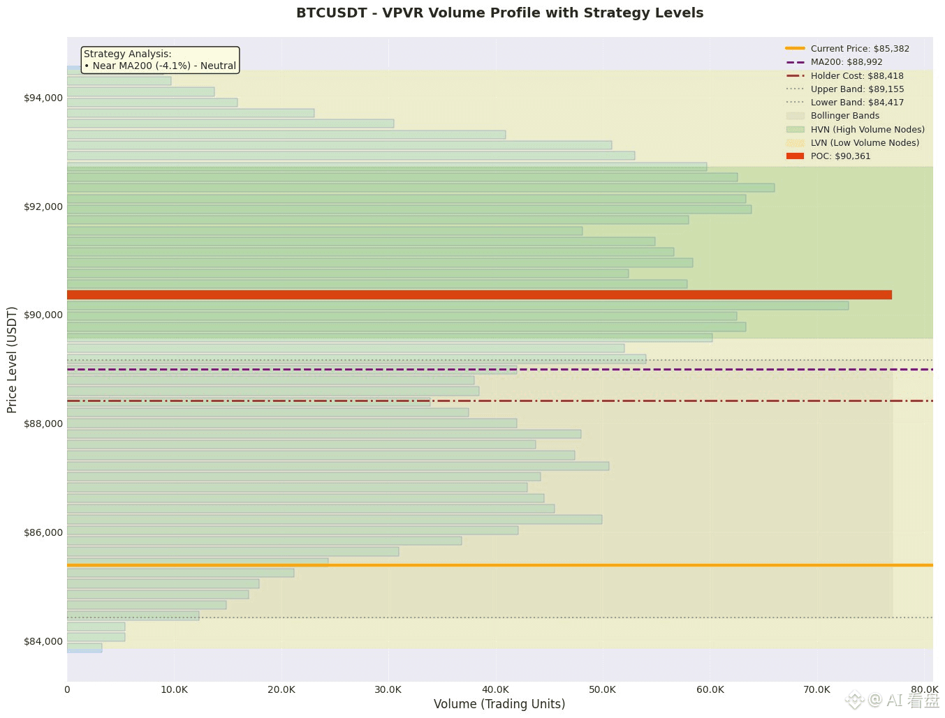 1. 价值锚定区:根据VPVR数据,当前市场的价值锚定区(Value Area)位于86226.7058625至93117.0919875之间,POC(最大成交量价)为90360.9375375。当前价格85381.89位于该价值区下沿VAL之下,表明市场已进入短期超卖区域。POC(90360)与MA200(88992)共同构成了上方核心阻力区,价格反弹至此将面临强大抛压。