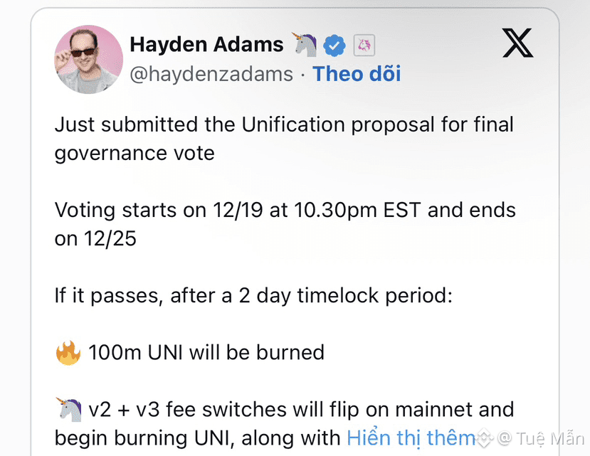 Theo chia sẻ của Hayden Adams, đồng sáng lập Uniswap, trên nền tảng X, cuộc bỏ phiếu bắt đầu từ thứ Sáu và sẽ kết thúc vào ngày 25/12. Nếu được thông qua, đề xuất này có thể mở ra một loạt thay đổi quan trọng đối với mạng lưới Uniswap, đáng chú ý nhất là kế hoạch đốt khoảng 100 triệu token UNI.