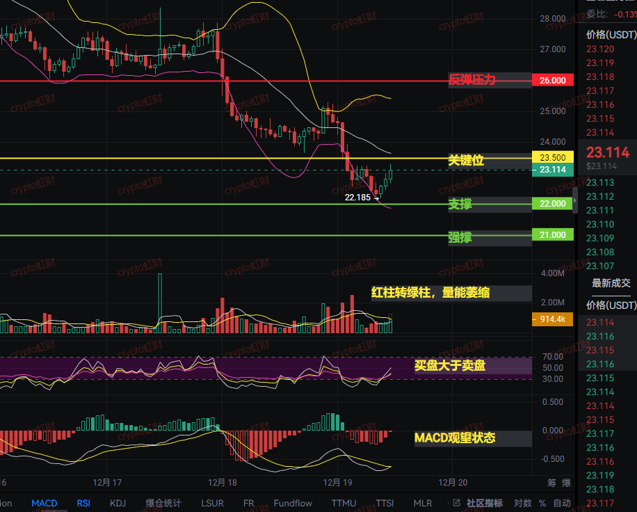New players: Remember, the whales can afford to play, but you can't. The market is highly volatile now, and you might get trapped as soon as you enter. It is advisable to wait and consider small positions once it stabilizes at 23.5; if it breaks below 22, hold off on bottom fishing.