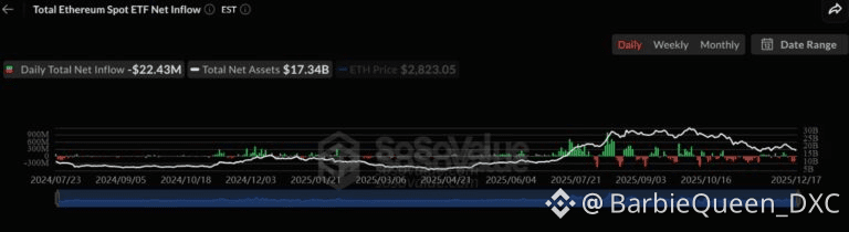 On the 17th of December, for example, outflows jumped to -$22.43 million, reflecting intense selling pressure. As a result, Ethereum’s Spot ETFs saw Total Assets drop from $21 billion to $17 billion, marking a $4 billion dip in five days.