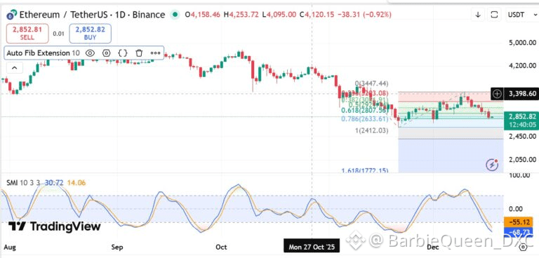 At press time, ETH hovered just above the 0.618 Fibonacci Retracement near $2,807. A failure to hold that level could open the door to a move toward the 0.786 retracement around $2,633.