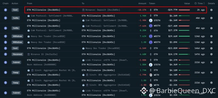A few hours earlier, the same address deposited 10,169 ETH, valued near $29.77 million, realizing an additional $11.36 million gain.