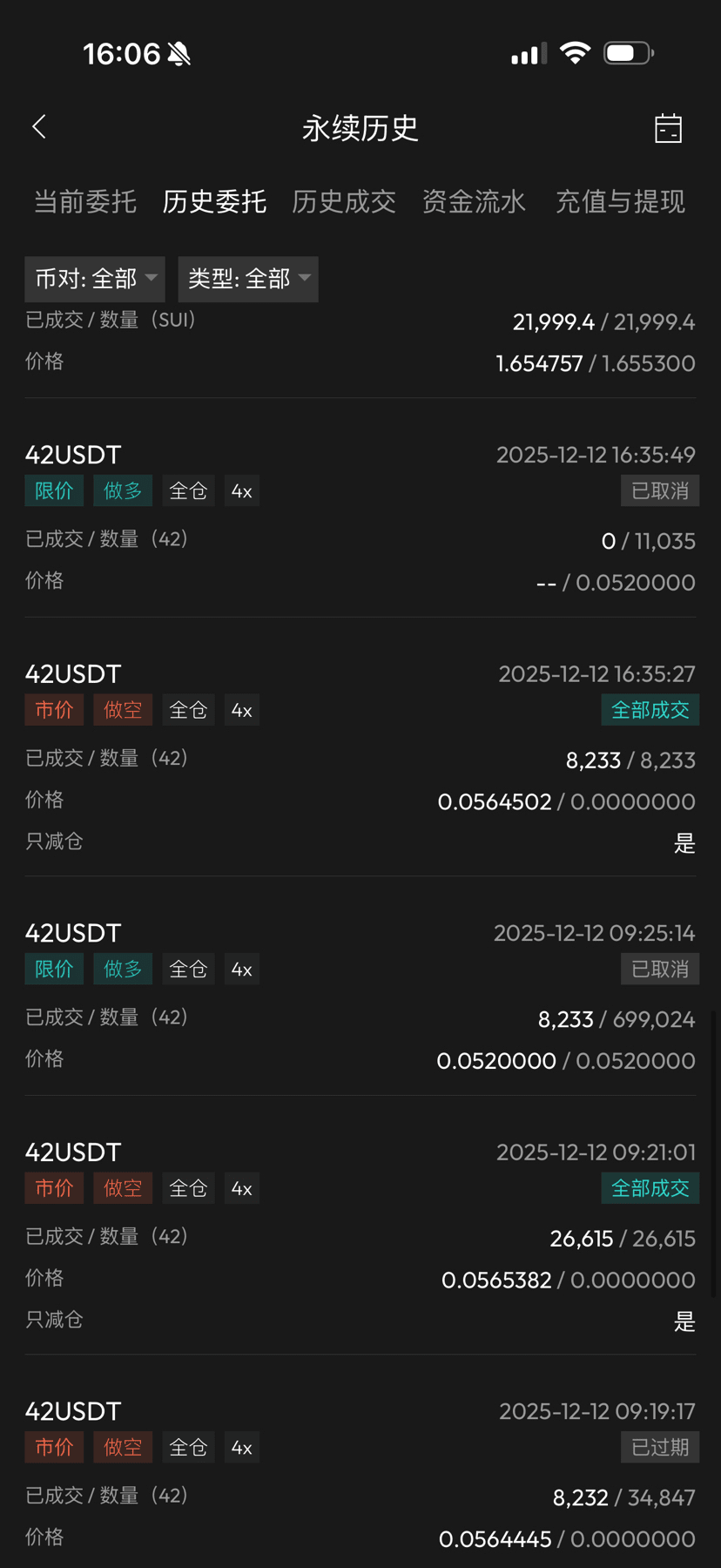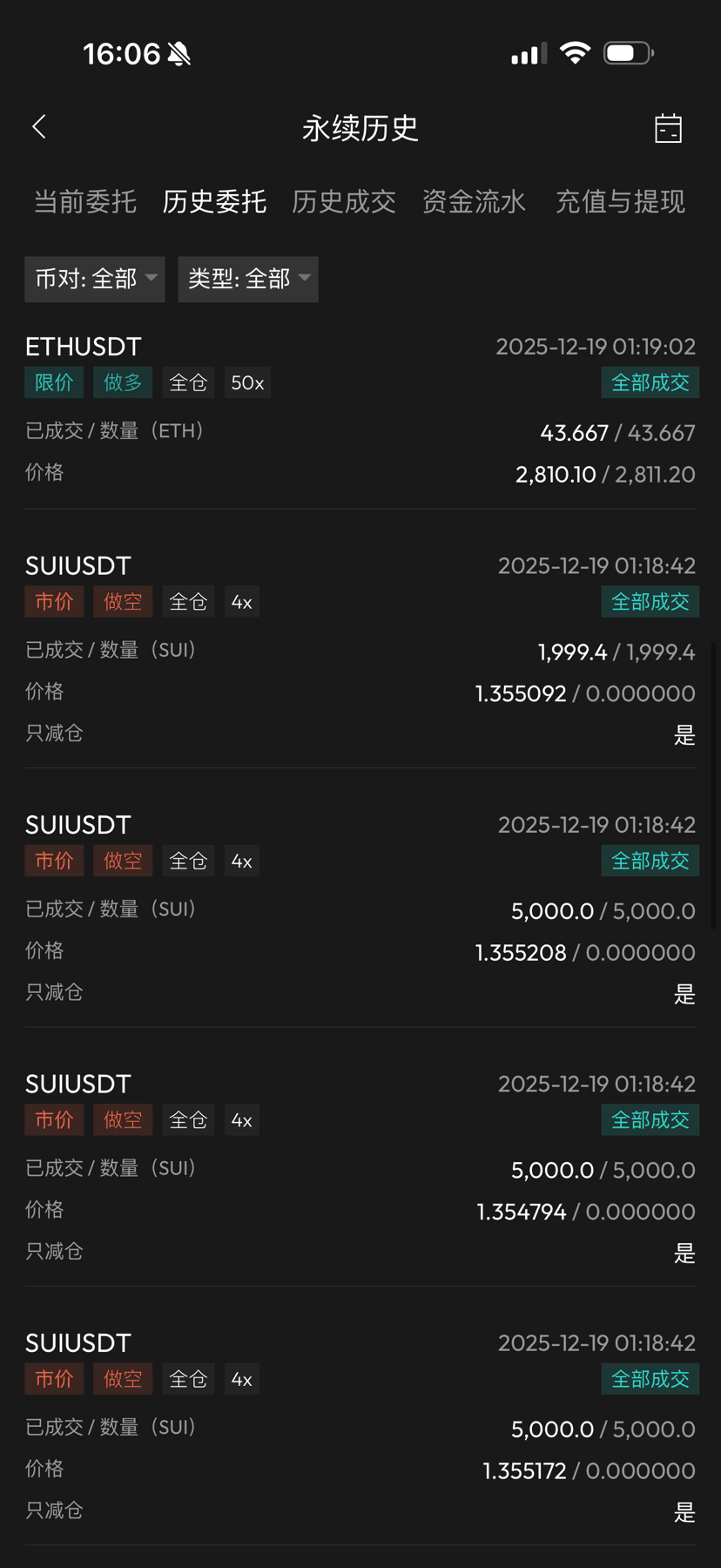 Recent operations are as follows: the long position of 42 was closed on the day of the surge on December 12th, I closed it a bit early, otherwise I would have been able to break even. After closing, I only lost 1000u. Then I used 9000u to open a 4x long position on SUI, the market trend was still quite good at that time, and the liquidation price was below the historical low. Subsequently, the market continued to decline, and by last night my account only had 2400u left. After closing, the SUI long position had a loss of over 6000u. With a mindset of 'let it break if it must,' I opened a 50x long position at the Ethereum price of 2810, totaling 44 Ethereum. This morning, I closed the position at the Ethereum price of 2910, making a profit of over 4300u, successfully selling at 70 basis points.