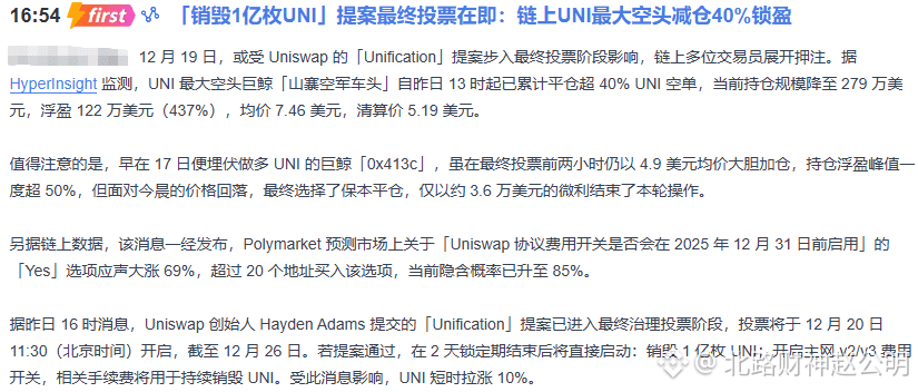 今天最炸的消息,就是Uniswap“销毁1亿枚UNI”的提案进入最终投票。这确实是长期大利好,但聪明钱早就动手了。链上数据显示,最大空头已经提前平掉40%空单,这既说明空头怕了,也说明有人借着市场情绪在悄然调仓。