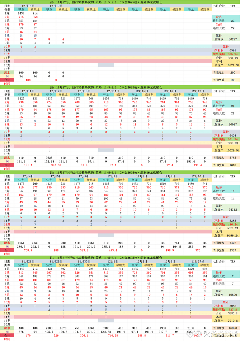 在30秒场次中,我们同时运行了两套参数方案:“10-5-2.1”与“11-5-2.1”,分别从11月28日和11月27日开始执行,至今已持续20余天。今天,我们基于完整的原始数据记录,进行一次客观的对比分析。本文仅为系统化操作的思路探讨与数据记录,不涉及任何投资建议。