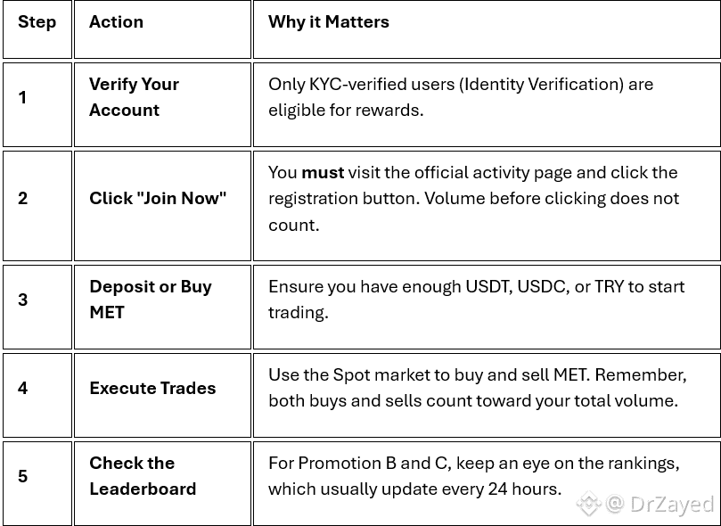 • Eligible Pairs: MET/USDT, MET/USDC, and MET/TRY.