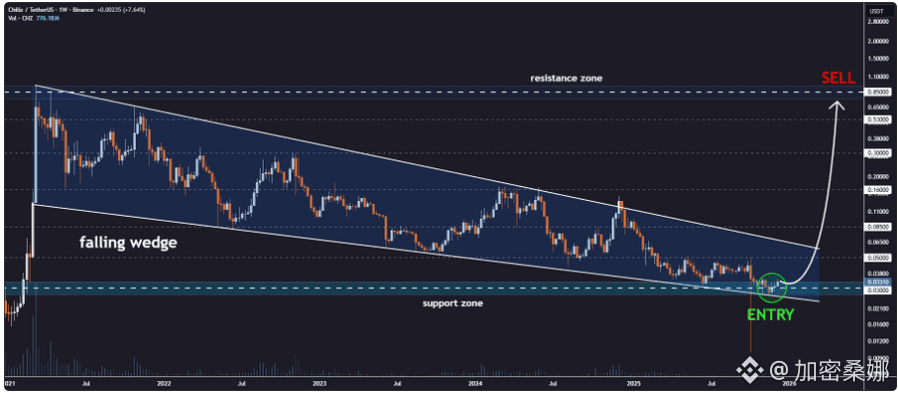 技术面也有看点:CHZ周线在下跌楔形里走(通常是看涨信号),现在在0.035-0.037美元支撑位稳住了,之前每次跌到这都有买家接。要是能守住往上冲,突破楔形顶部阻力,后续可能有更猛反弹,分析师给的长期目标最高到0.3美元以上。