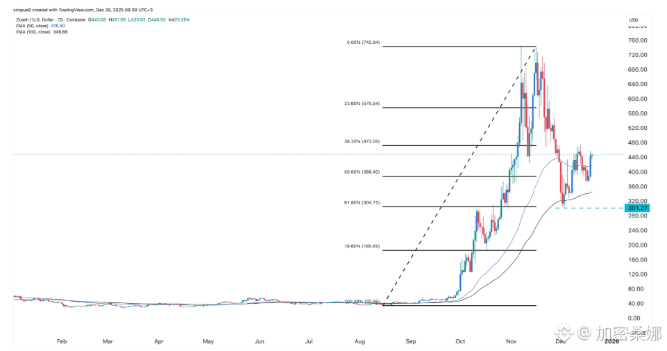 技术面看,ZEC本月初跌到300美元触底后反弹,现在448美元,快碰到472美元的斐波那契回撤位,还站在50日、100日均线上方,大概率继续冲500美元。但也要防回调,日线有形成看跌旗形的迹象,可能先跌一波再涨。
