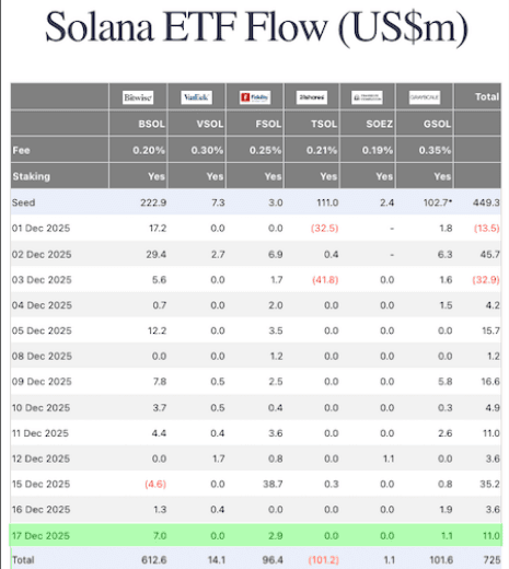 Meanwhile, the Solana spot ETF is also absorbing funds during the pullback. On December 18, the SOL spot ETF recorded a net inflow of about $11 million. This means that even as spot prices weaken, institutional products continue to absorb supply, offsetting some of the selling pressure. The flow of funds indicates that investors are still positioning during panic sell-offs, and institutional investors seem willing to increase holdings during heightened market volatility, with ETF trading activity reinforcing demand in the market during short-term weakness.