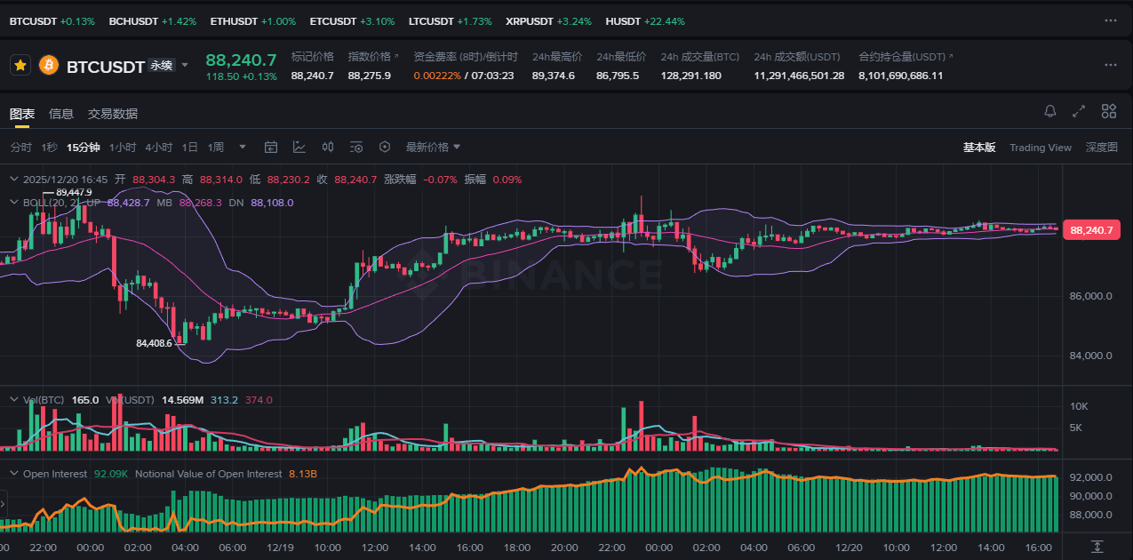 Today, Bitcoin is still fluctuating around 88k. This 'painting door' market is boring, but for both spot and contract players, it is an expected consolidation washout. The market remains relatively weak, with fluctuations up and down, making contract operations more difficult. However, one point is quite clear: a change in trend is imminent, and high open interest (OI) will inevitably be accompanied by a violent directional breakout.