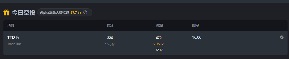 This afternoon at four o'clock, the TTD launched on Binance Alpha has allowed many friends to benefit from another wave of airdrop bonuses. I looked at the data, and the Alpha rewards claimed have now exceeded 50U. This operation is indeed a good return for users who have accumulated enough Alpha points. Recently, observing the overall performance of the Alpha project, one can clearly feel a trend of warming. From VOOI, LISA to RTX, ZKP, although the fluctuations are still drastic, those projects with solid backing can still bring decent returns to early participants.