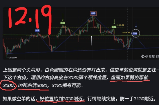 Yesterday's Ethereum analysis suggests a weak market for shorting at 3000, and aggressively at 3080. The suggested short position is 3030, with actual orders set at 3020-3030-3040, and the market peaked around 3017.99, which of course didn't get filled. I chased a bit at 3000 and took 30 points.