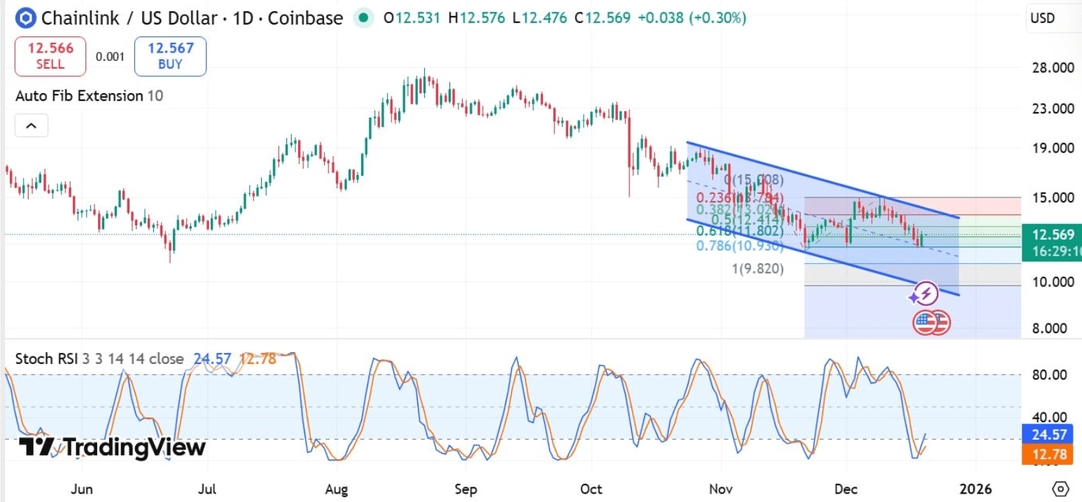 On the daily timeframe, the price of Chainlink (LINK) has bounced back from a low of 11.7 USD and is trading around 12.5 USD at the time of writing.