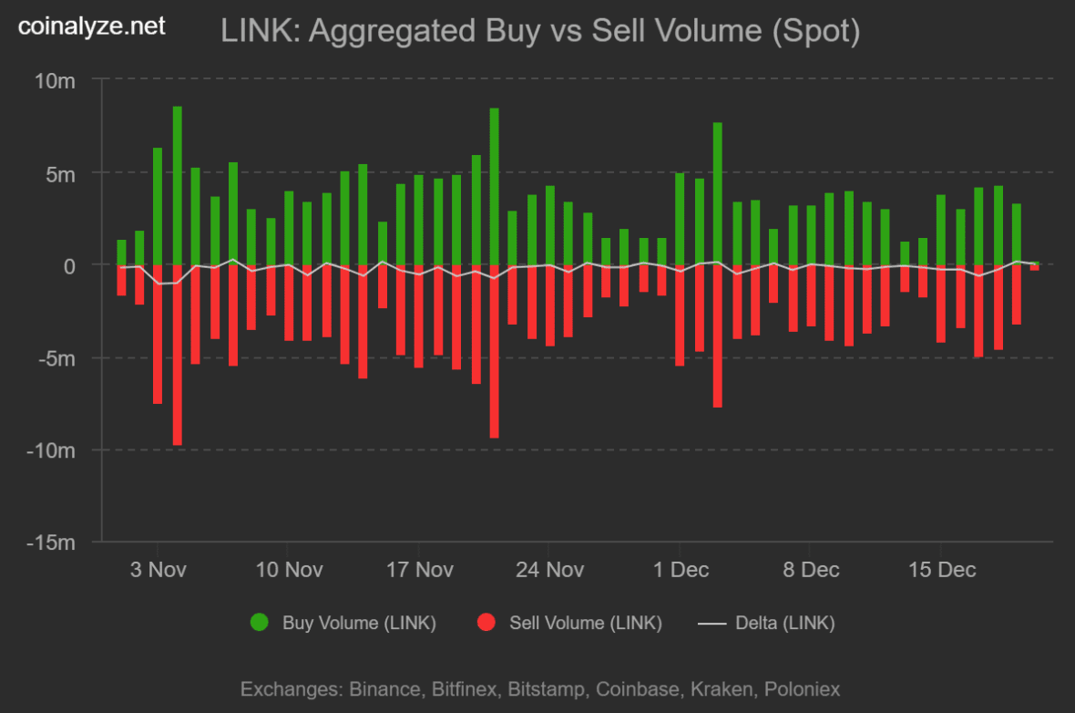 This move has triggered bottom-fishing demand, helping the altcoin bounce back. Data from Coinalyze shows that the buying volume reached about 3.5 million LINK, slightly exceeding the 3.2 million LINK on the sell side.
