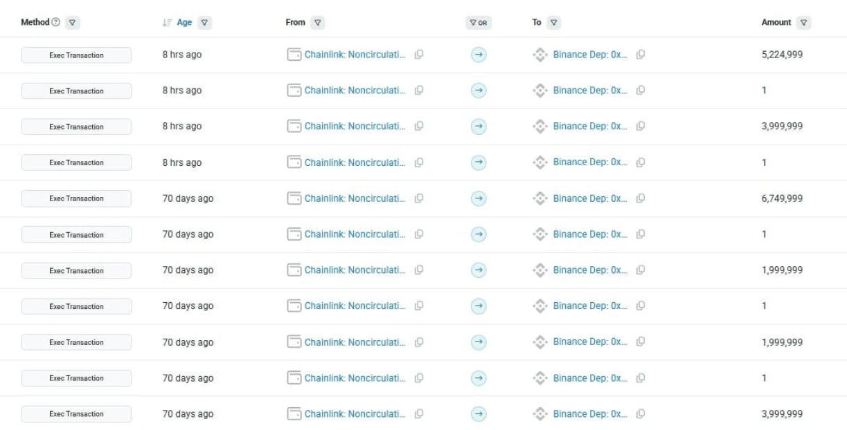 Of this, 9.23 million LINK – equivalent to about 116 million USD – was transferred to Binance through two large deposit transactions. Specifically, one transaction recorded about 5.22 million LINK, while the other transferred nearly 4.0 million LINK. The remainder, 2.02 million LINK (approximately 25 million USD), was moved to a multisig wallet linked to the Chainlink ecosystem.