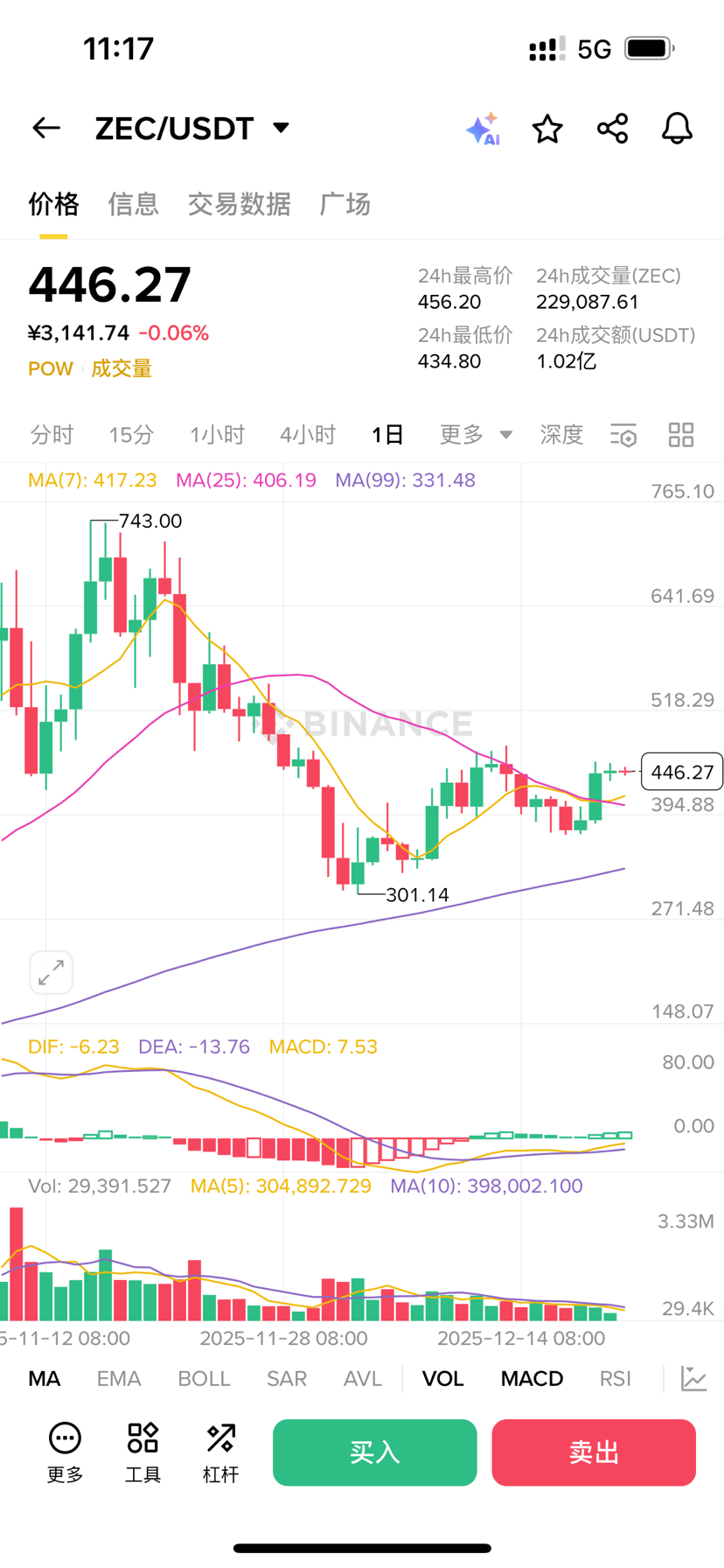 In the past couple of days, ZEC has been moving in a very 'steady' manner. The price has been fluctuating between 440 and 460, neither going up nor down, like a straight line. The trading volume is also sluggish, making it seem like the market has suddenly fallen asleep.