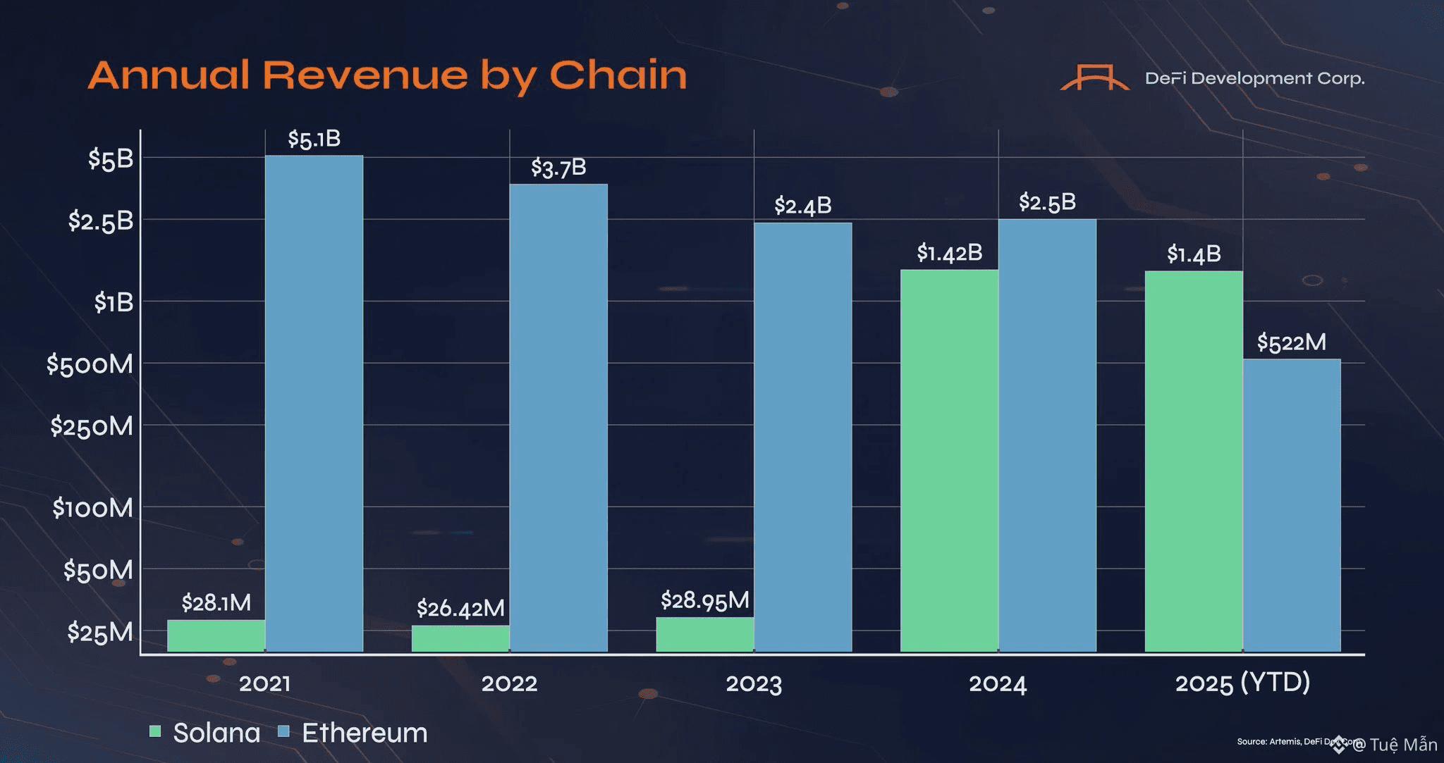 Theo các đồ họa do DeFi Development Corp.công bố, doanh thu của Solana được dự báo sẽ đạt khoảng 1,4 tỷ USD, cao hơn đáng kể so với mức 522 triệu USD của Ethereum. Yakovenko cho rằng những con số này phản ánh một thay đổi mang tính cấu trúc, khi thị trường ngày càng chú trọng đến khả năng tạo doanh thu thực tế của các blockchain, thay vì chỉ dựa vào câu chuyện hay kỳ vọng đầu cơ.