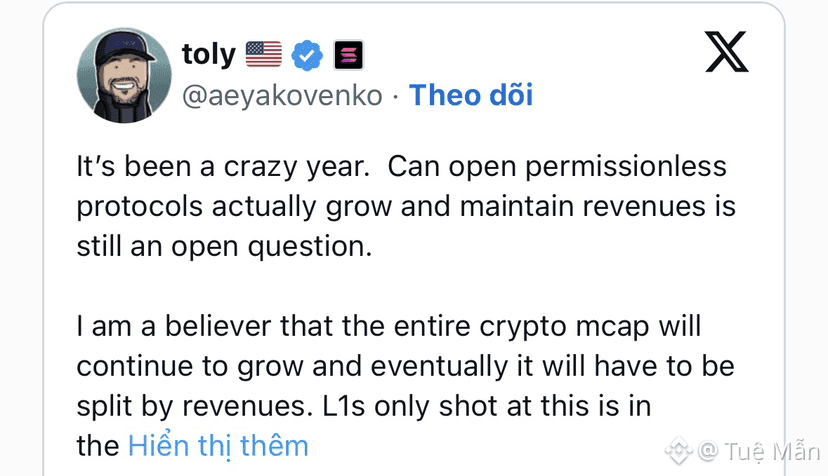 Yakovenko tin rằng tổng vốn hóa thị trường crypto sẽ tiếp tục mở rộng, nhưng nhấn mạnh rằng trong tương lai, giá trị sẽ phải được “phân chia theo doanh thu”, thay vì chỉ dựa trên câu chuyện hay mức độ đầu cơ. Trong bối cảnh đó, ông cho rằng các blockchain Layer-1 chỉ có một con đường rõ ràng để duy trì tính liên quan dài hạn.