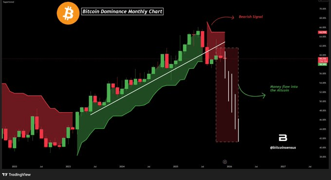 According to a tweet from Bitcoinsensus, the monthly chart confirms the bearish trendline break. Bitcoin dominance was rejected near 65%, a level that previously acted as a macro ceiling in 2017 and 2021. This rejection signals the end of Bitcoin’s relative outperformance cycle. Monthly timeframe breaks reflect sustained capital flows rather than short-term speculative movements.