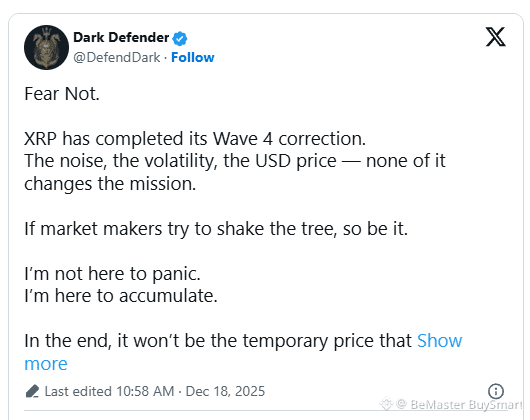 Dark Defender addressed the current market mood with a clear stance. “XRP has completed its Wave 4 correction,” he wrote. He dismissed daily volatility and short-term price swings, adding, “The noise, the volatility, the USD price — none of it changes the mission.”
