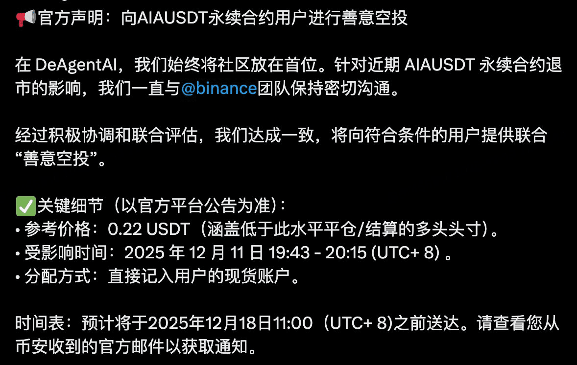 Event review: On December 11, due to contract upgrades, Binance AIAUSDT perpetual contract was temporarily taken down, and some long position users were passively liquidated between 19:43 - 20:15.
