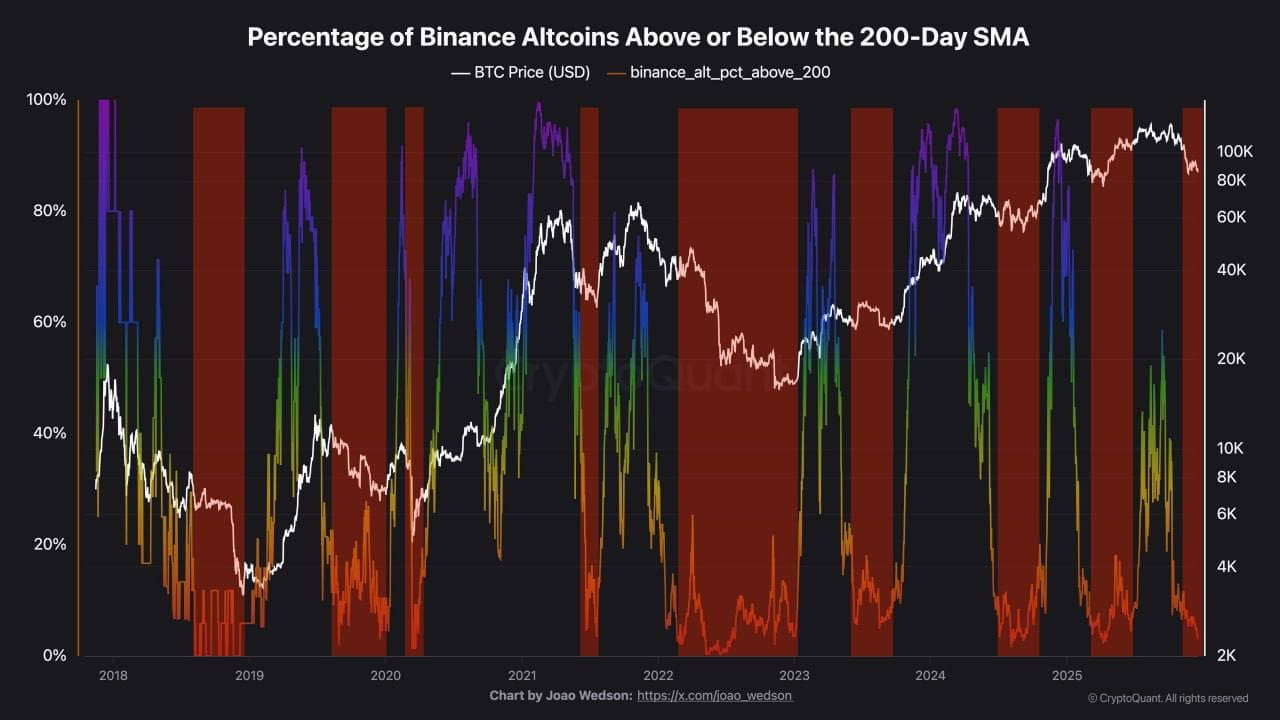 In this context, only about 3% of altcoins on Binance are trading above their 200-day moving average. This is historically low and a direct reflection of the fact that investors now prefer to protect capital rather than enter high-risk assets.