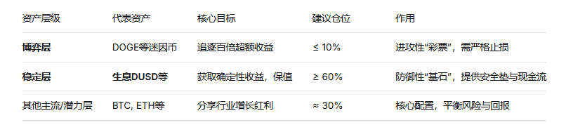 Certainty yield layer (like DUSD and other interest-bearing stable assets): This is the 'ballast' and 'cash cow' of your assets. Allocate the majority of your funds here, aiming for stable annual returns unaffected by macro and market sentiment. The role of this portion of assets is to protect your principal during market downturns and provide continuous ammunition for bottom-fishing during extreme panic when 'golden pits' arise.