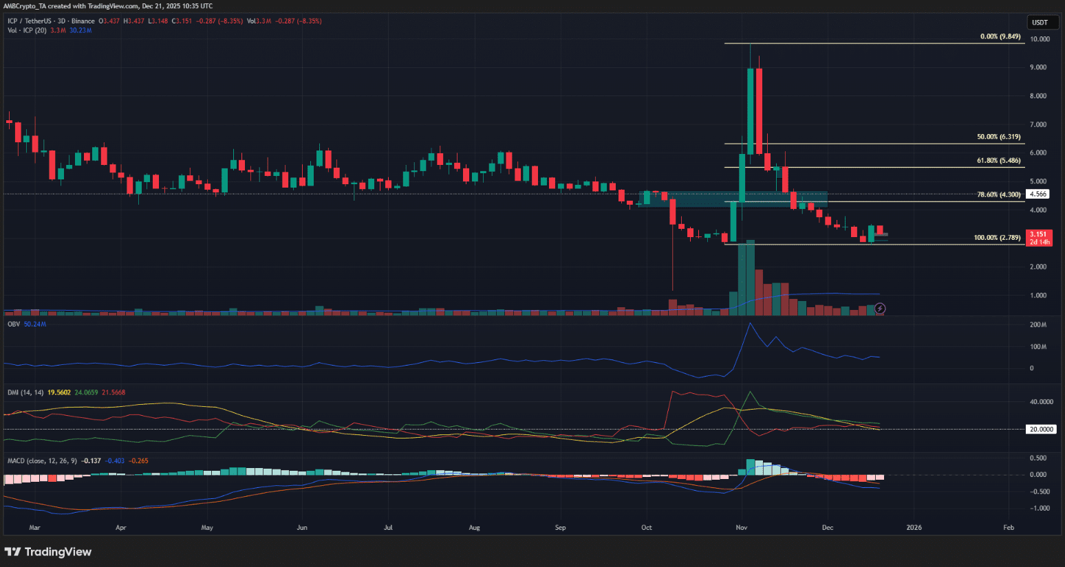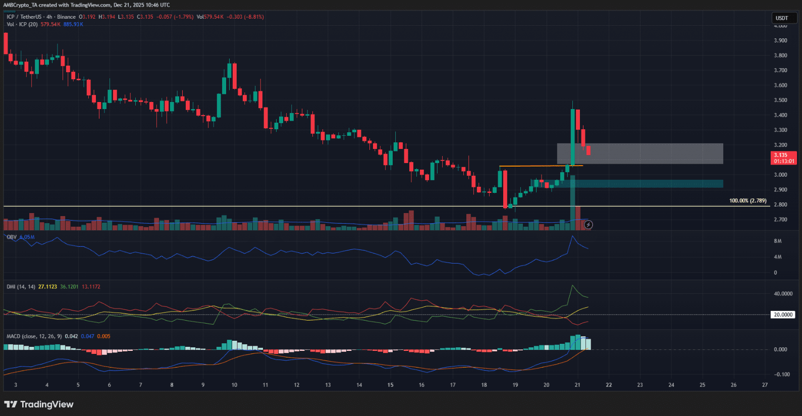 The 4-hour frame chart shows a notable price imbalance around the 3.2 USD mark, highlighted in white. This area formed right after the bullish structure was broken, indicating that market momentum has significantly weakened. At the time of writing, ICP is entering a short-term correction phase, recording a decrease of 8.46% in less than 12 hours, reflecting increased profit-taking pressure.