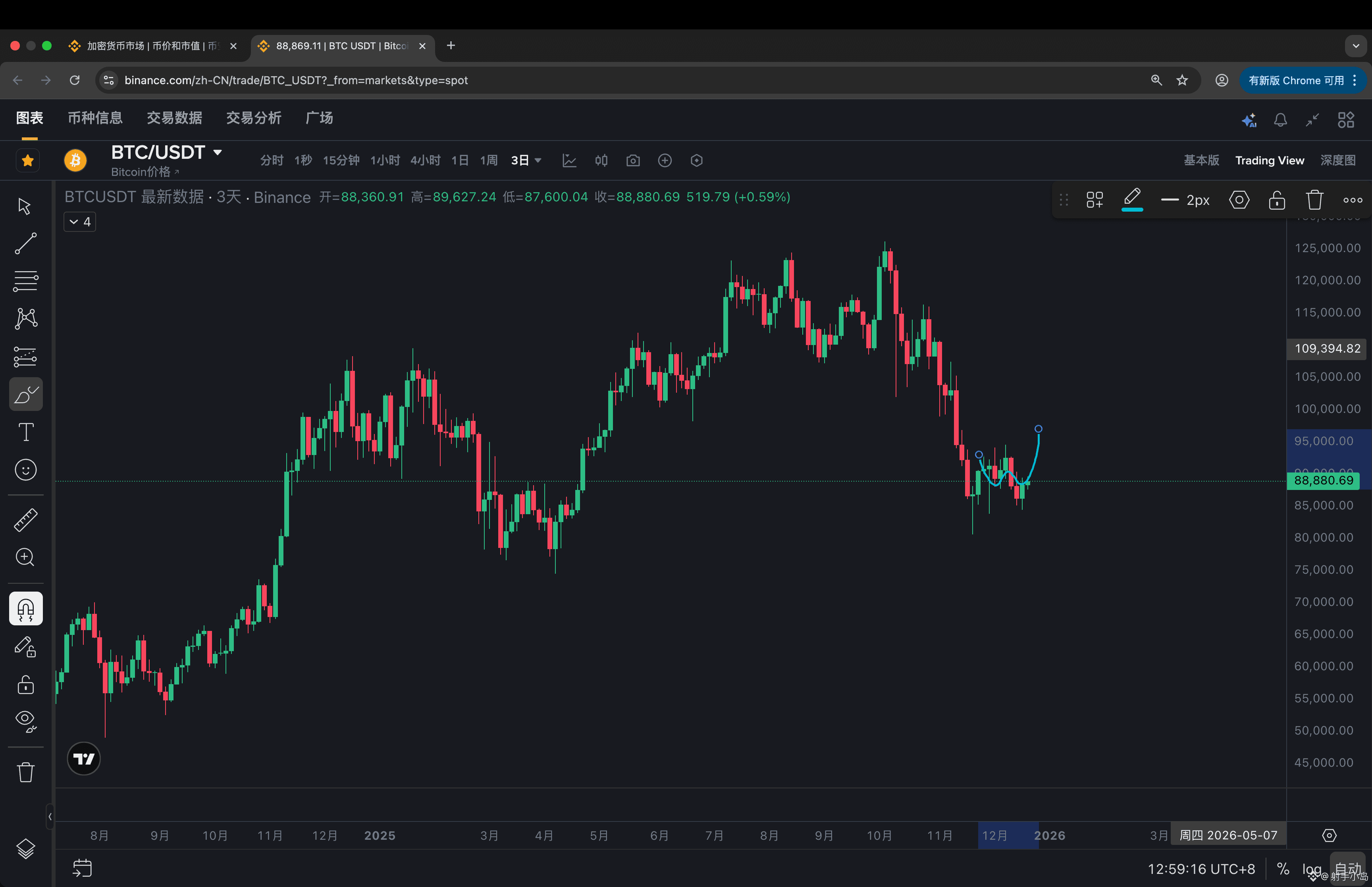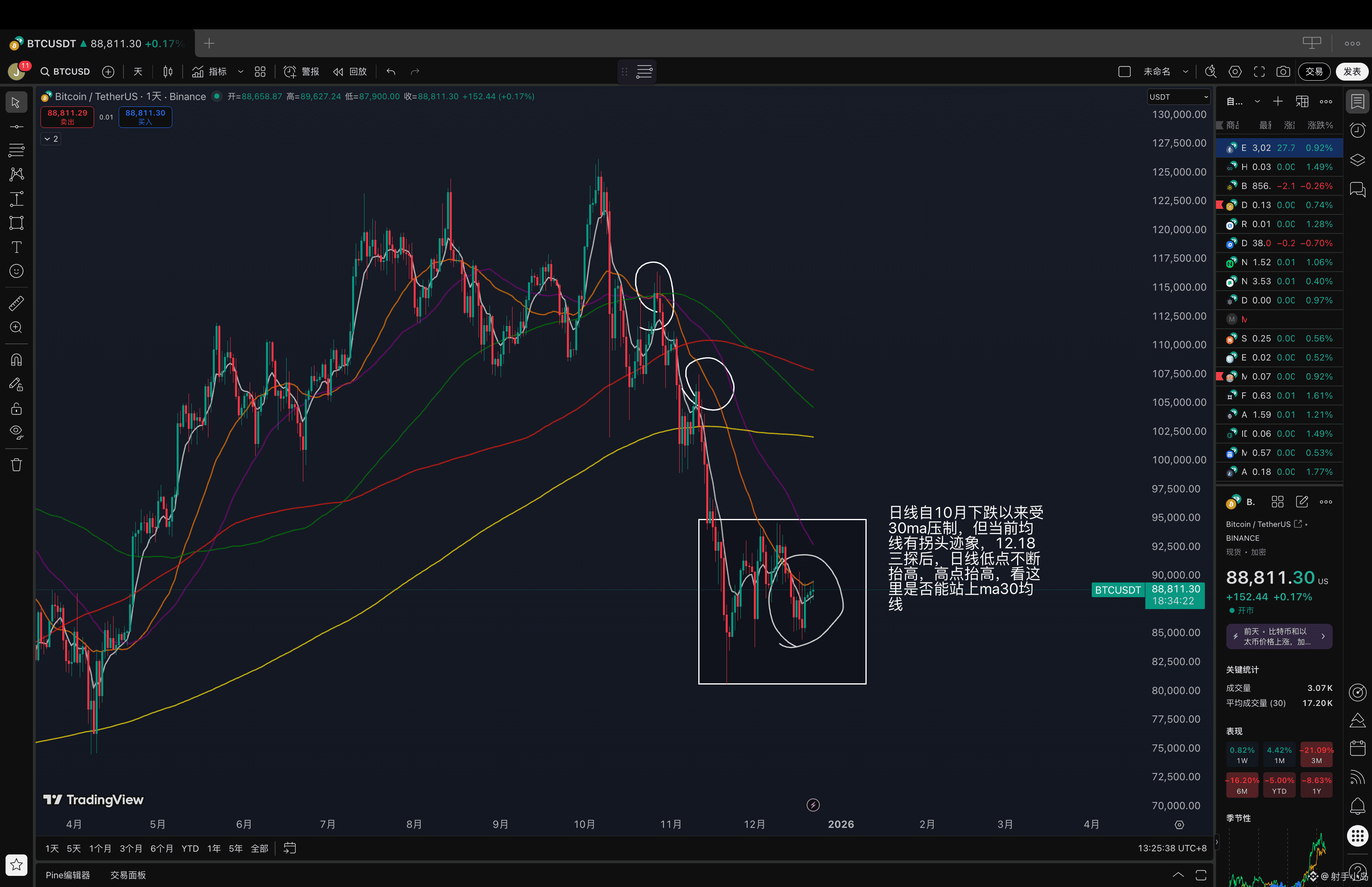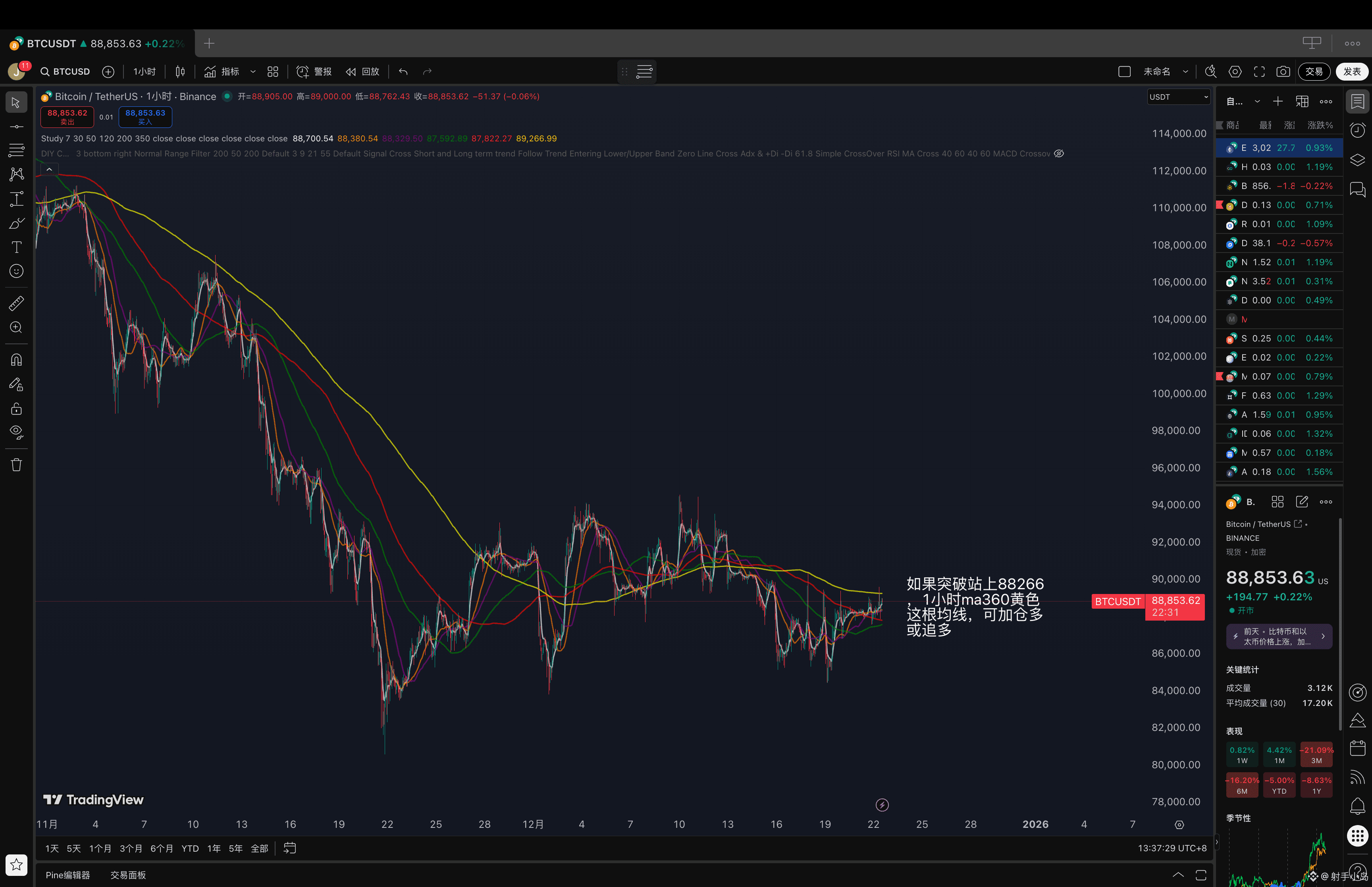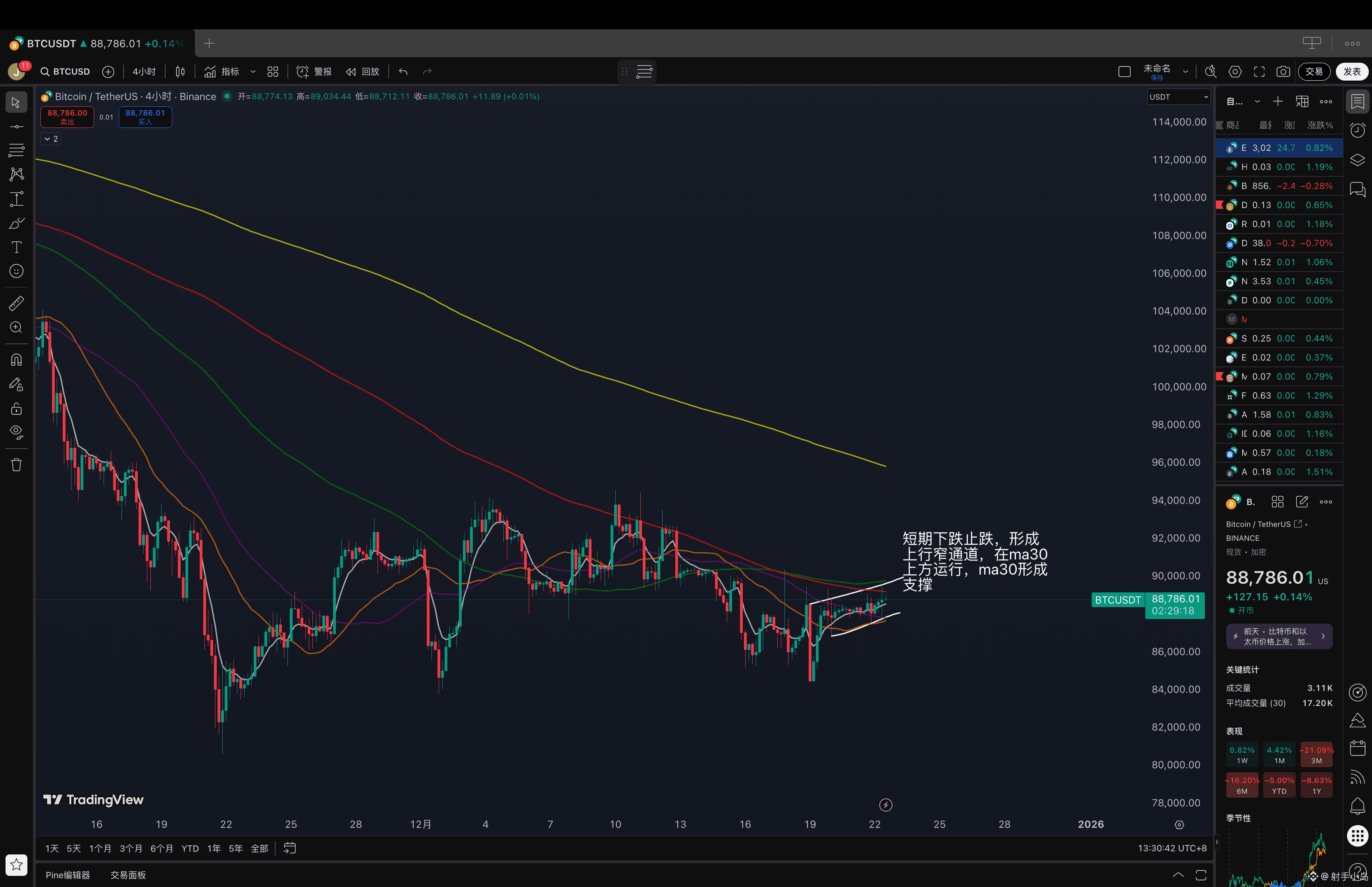 短线回调接多,可观察回踩88500附近。如放量跌破4小时ma30均线87500附近,再考虑止损或做右侧空。