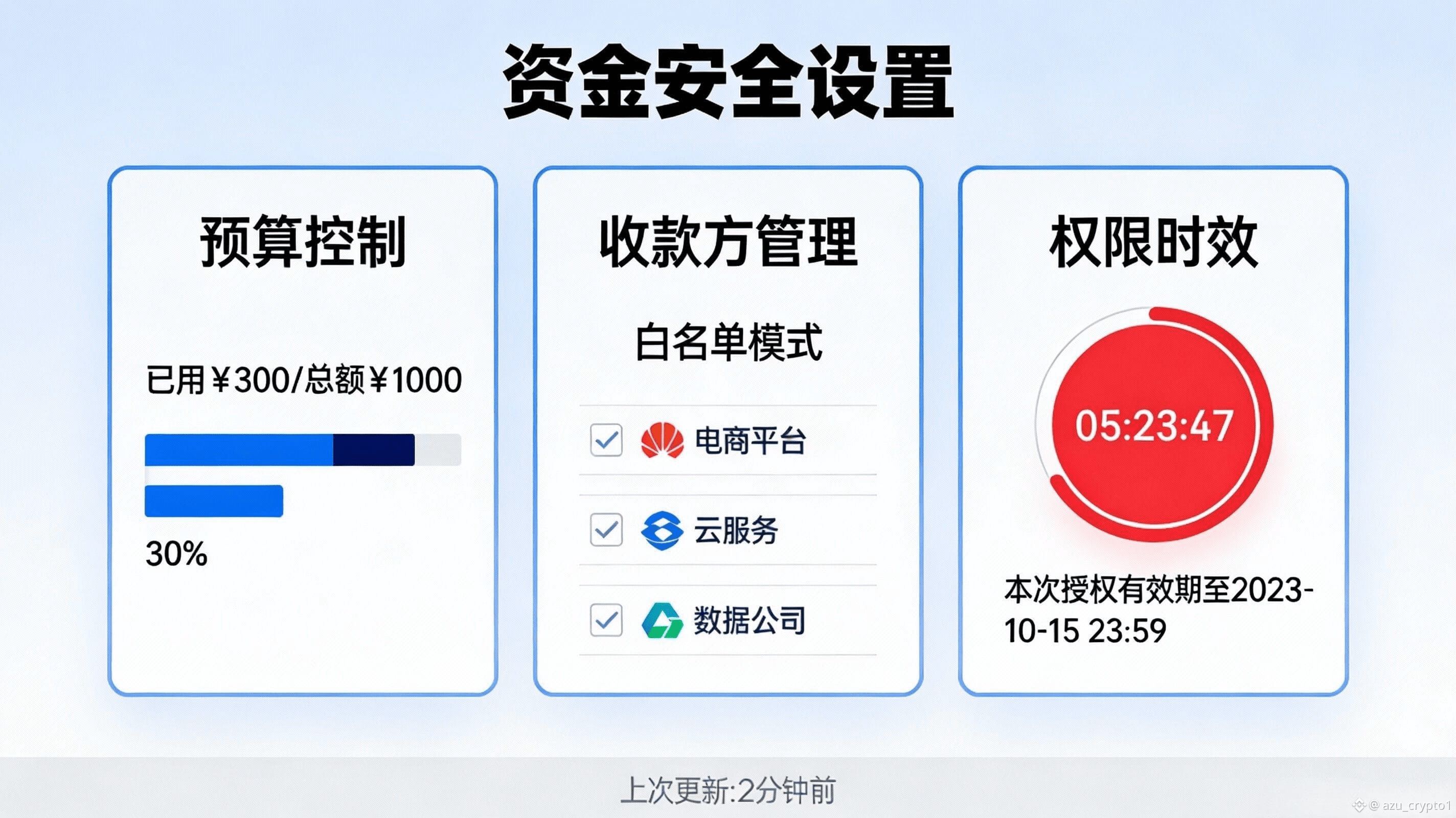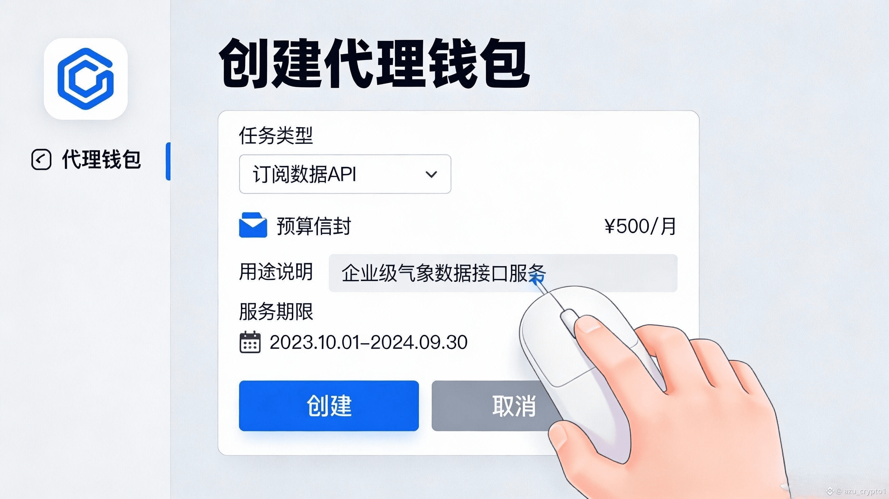 第一步的核心原则其实很简单:永远不要让用户做“全权托管”的第一次。第一次必须是“可控授权”,而且是肉眼可见的可控。你在界面上不应该写“授权代理管理资金”,而应该写得像给员工发零花钱:给它一个信封、一个用途、一个期限。比如用户第一次创建代理钱包,你不要先问“要不要开启自动支付”,你先让他选一个具体任务:订阅一个数据 API、充值一个广告平台、订一次差旅。因为抽象的授权让人恐惧,具体的任务让人放心。任务越具体,用户越容易在脑子里模拟风险边界。
