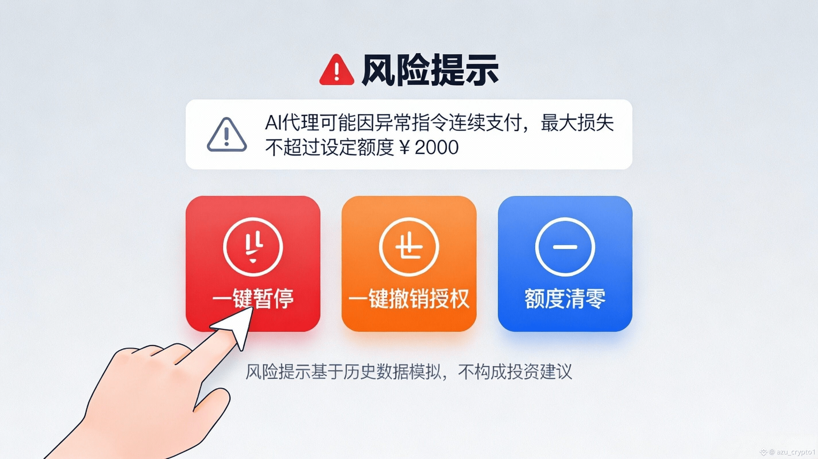 风险说明书千万别写成“免责声明”,要写成“你能失去什么、你能怎么停”。普通人的阅读路径是:先看最坏情况,再看自救按钮,再看是否值得。最坏情况要写得直白,比如“代理可能会为错误的服务付费”“可能会重复付款”“可能会在高频调用中耗尽预算”。然后你立刻给出三种自救方式,而且必须在同一屏:一键暂停、一键撤销授权、把额度降到 0。用户只要确认“我随时能刹车”,就会更愿意尝试。相反,如果你把“撤销”藏在设置深处,用户会默认你不希望他退出,那他也不会进来。